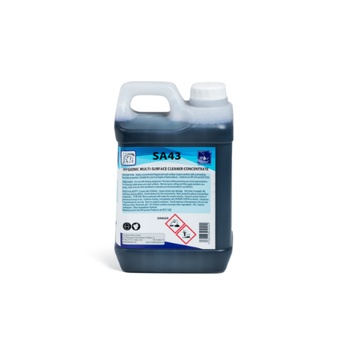 SA43 Hygienic Multi Surface Cleaner Concentrate is a highly concentrated cleaner sanitiser designed for professional hygiene applications across commercial environments. It delivers outstanding biocidal performance while leaving a fresh fruity floral fragrance after use. Effective in all water conditions, it sanitises hard surfaces including laminates, vinyls, paintwork, fittings, and bathroom areas. The advanced formulation also removes stubborn marks from upholstery, leather, and carpets. Designed for controlled dosing systems, it ensures accurate dilution and consistent sanitising results.